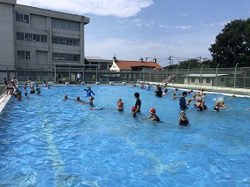 1学期中の水泳授業は、あまり天候に恵まれず曇り空の下での実施が多かったように思えます。打って変わって夏休みのプール開放では晴天に恵まれ、プールの水が気持ちよく、子どもたちのたくさんの笑顔を見ることができました。