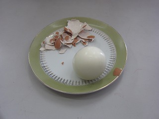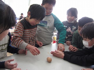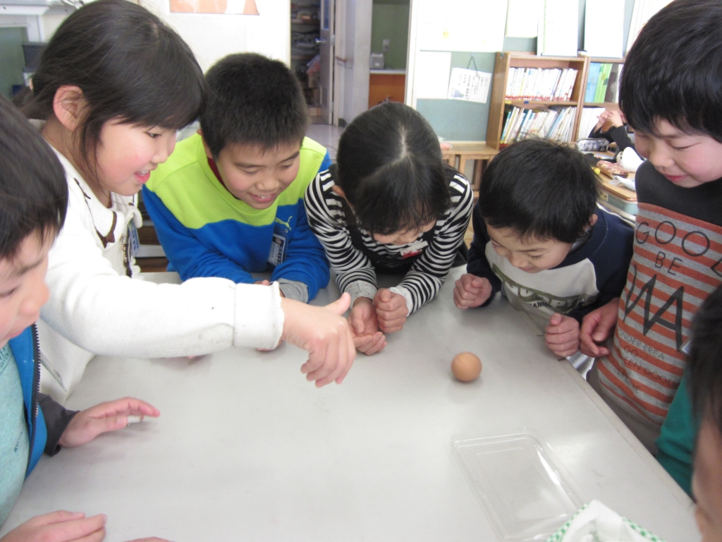 国語の説明文の内容のとおりに、生たまごとゆでたまごを回してみました。