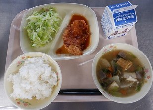 今日の献立は、デミかつ丼・千キャベツ・野菜椀・