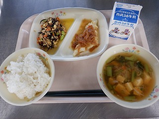 じゃがいもと小松菜のみそ汁・牛乳です。