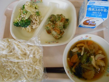 本日の給食は、肉うどん、牛乳、竹輪の磯辺揚げ、野菜のゴママヨ和え です。