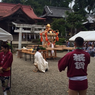朝7時に滝宮神社に多くの関係の方々がお神輿を囲んで集まり、、神様をお神輿にお迎えします。宮司さんたちの祝詞、お祭りの安全と盛況を祈る柏手の響き、法被姿の凜々しさ・・・。まだ涼しさの残る早朝、滝宮神社の杜に囲まれて経験したこの厳粛な中にも活気のある式は、大変印象深いものでした。