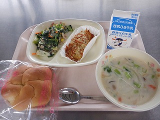 ほうれん草とコーンのソテー・かぶの豆乳スープ・牛乳です。
